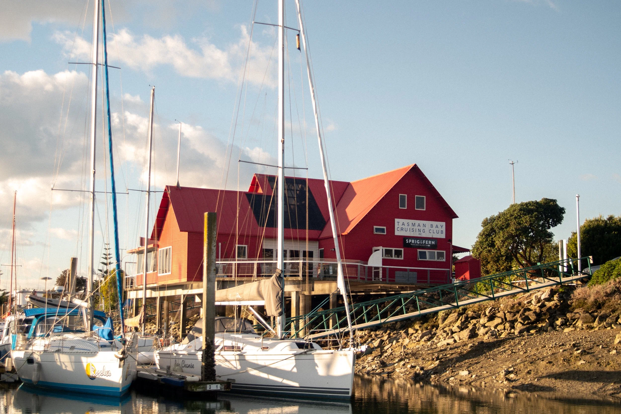 Several sailboats docked at a marina with a red building labeled 'Tasman Bay Cruising Club' in the background, under a partly cloudy sky.